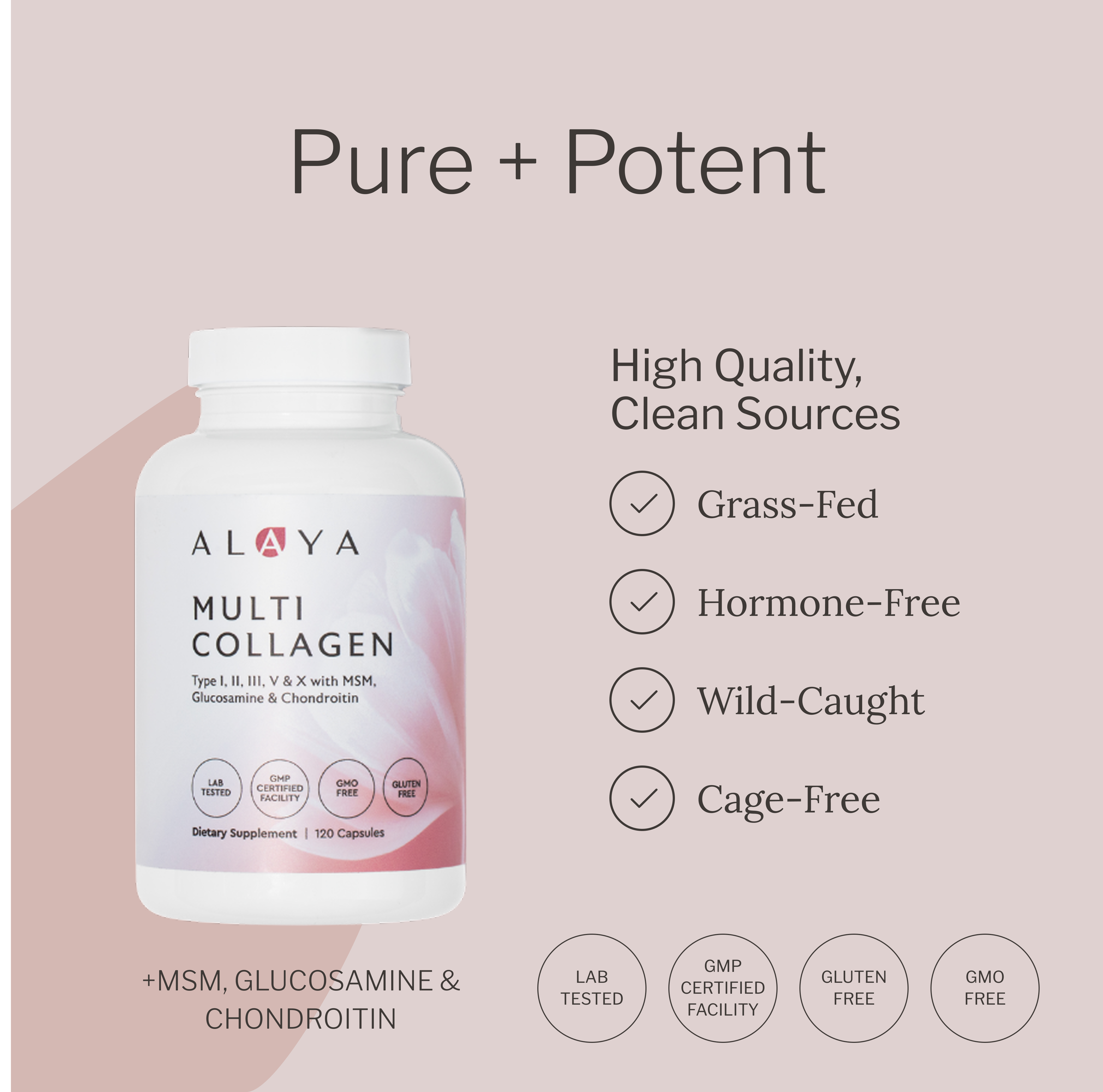 Now available in capsule form—Alaya Collagen is a multi-source collagen peptide blend of types I, II, III, V and X that contains the highest quality chicken, fish, bovine and egg collagen in addition to our proprietary hair, skin, and joint support blend.