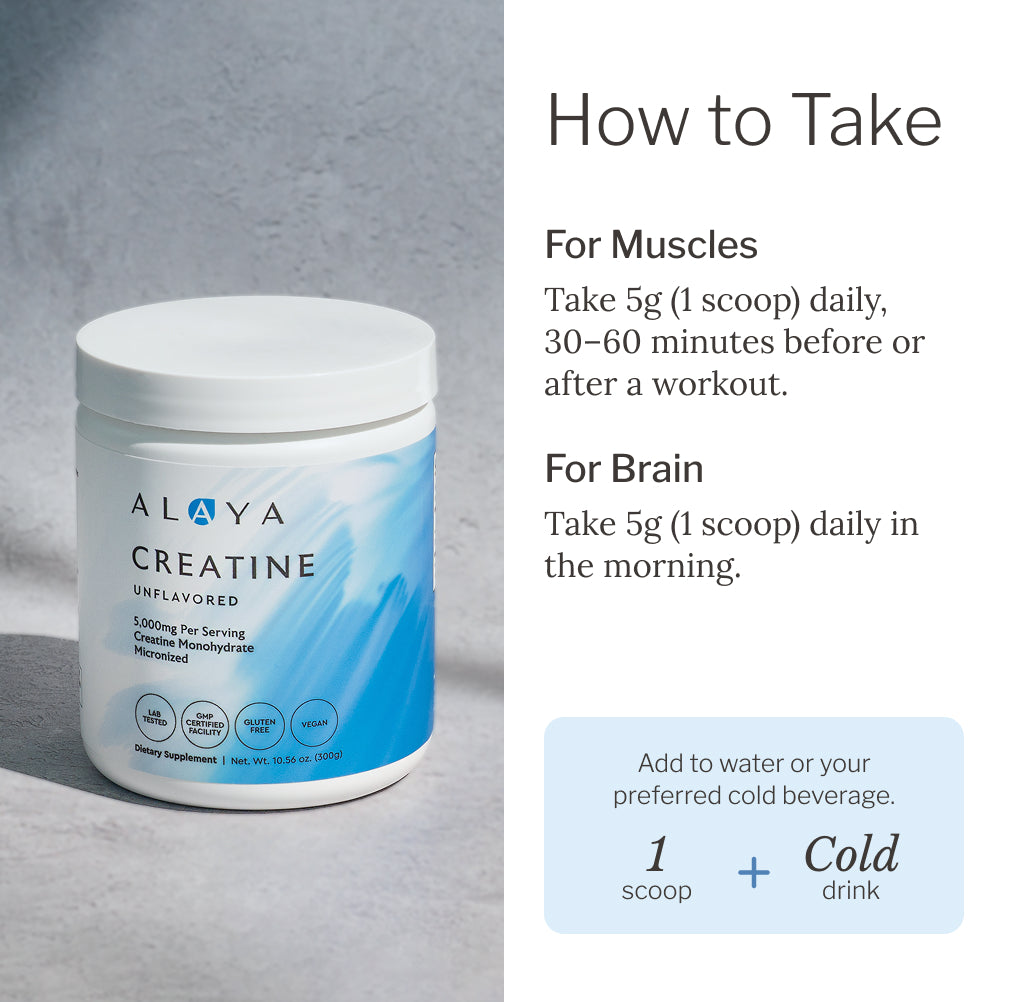 Creatine plays a crucial role in preserving lean muscle as you age—for everyone. Whether you're pushing through workouts or staying sharp throughout the day, Alaya’s high-quality, clean and easily mixable formula supports strength and endurance.