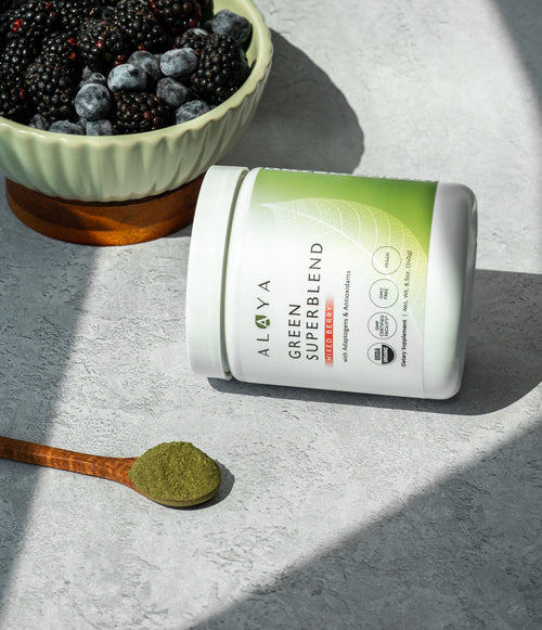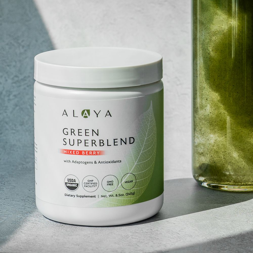 Alaya Green Superblend Mixed Berry supplement bottle on a white background #hide #flavor_mixed-berry
