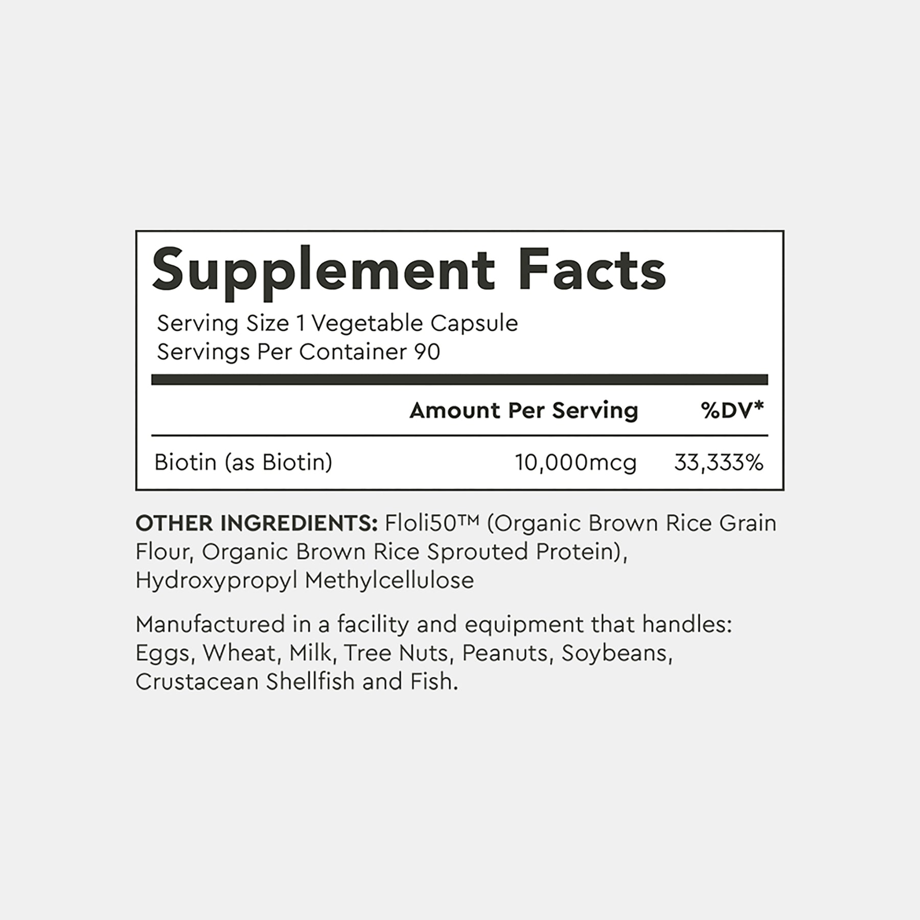 Daily biotin (vitamin B7) support designed to help maintain healthy hair, stronger-feeling nails, and nourished skin. A clean, straightforward way to give your body the biotin it naturally relies on.*